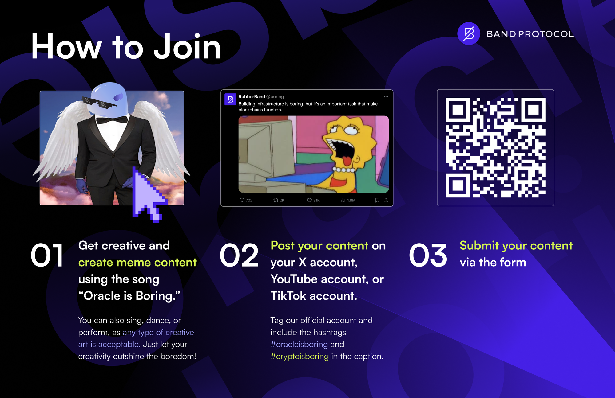 - Post your content on your X account, Youtube account, and TikTok account. Tag our official account and include the hashtag #oracleisboring and #cryptoisboring in the caption.