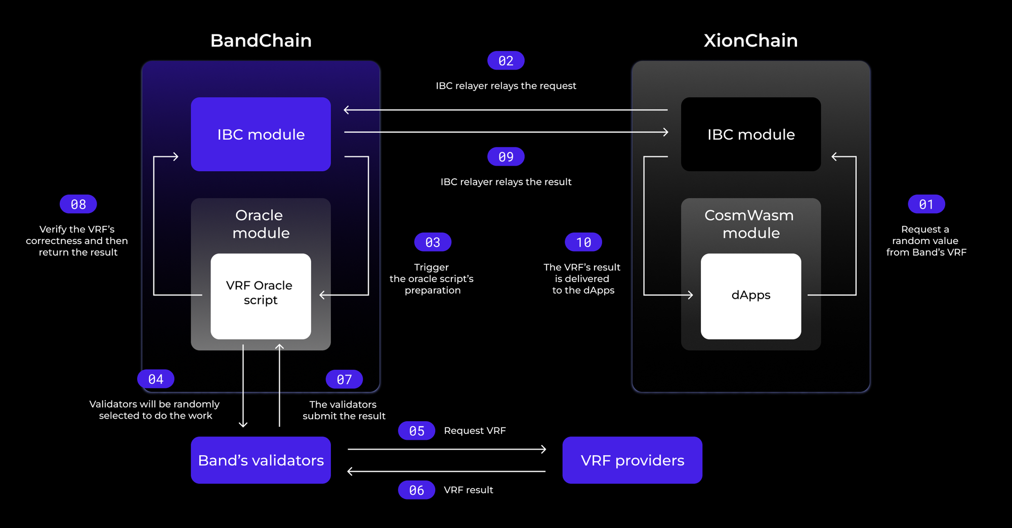 - A dApp on XionChain requests a random value from Band's VRF (Verifiable Random Function).
