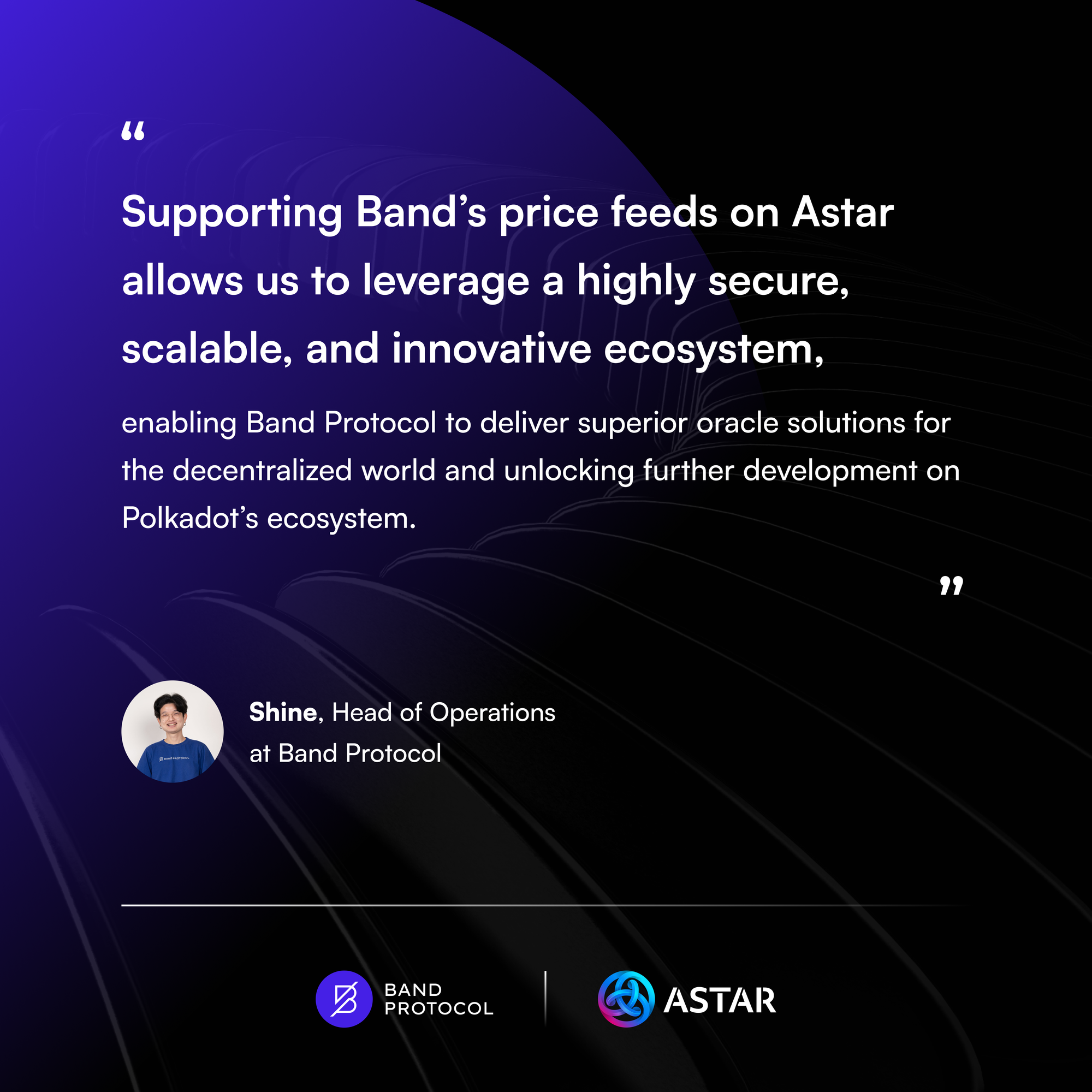 As our Head of Operations aptly puts it, "Supporting Band’s price feeds on Astar allows us to leverage a highly secure, scalable, and innovative ecosystem, enabling Band Protocol to deliver superior oracle solutions for the decentralized world and unlocking further development on Polkadot’s ecosystem.” — Shine Sutheeravet