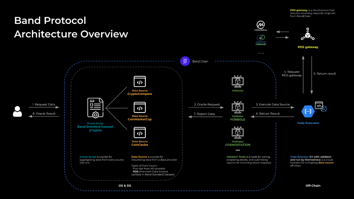 - PDS (Premium Data Source): To utilize paid services as a source of price data, the PDS component allows for the safe and secure retrieval of authenticated data from these services to BandChain. This enhances the quality and security of the data being used.
