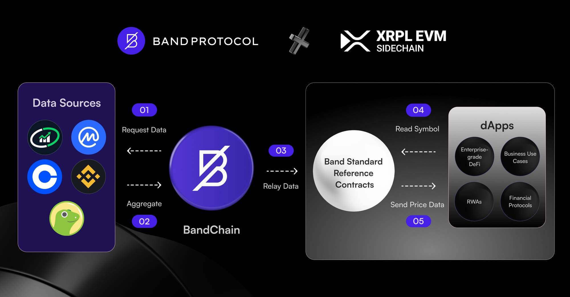 Our decentralized validator network aggregates data from multiple trusted sources like Binance, CoinGecko, and CoinMarketCap, processes it on BandChain using Byzantine Fault Tolerant consensus, and delivers the verified price feeds data on-chain to XRPL EVM.