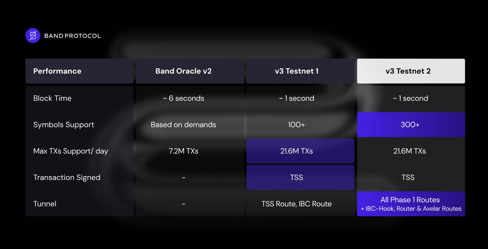 Band Oracle v3 Testnet Phase 2 delivers significant performance improvements over both Band v2 and the first phase of the Band v3 testnet. These enhancements reflect a fundamental shift in architecture and execution mechanics.