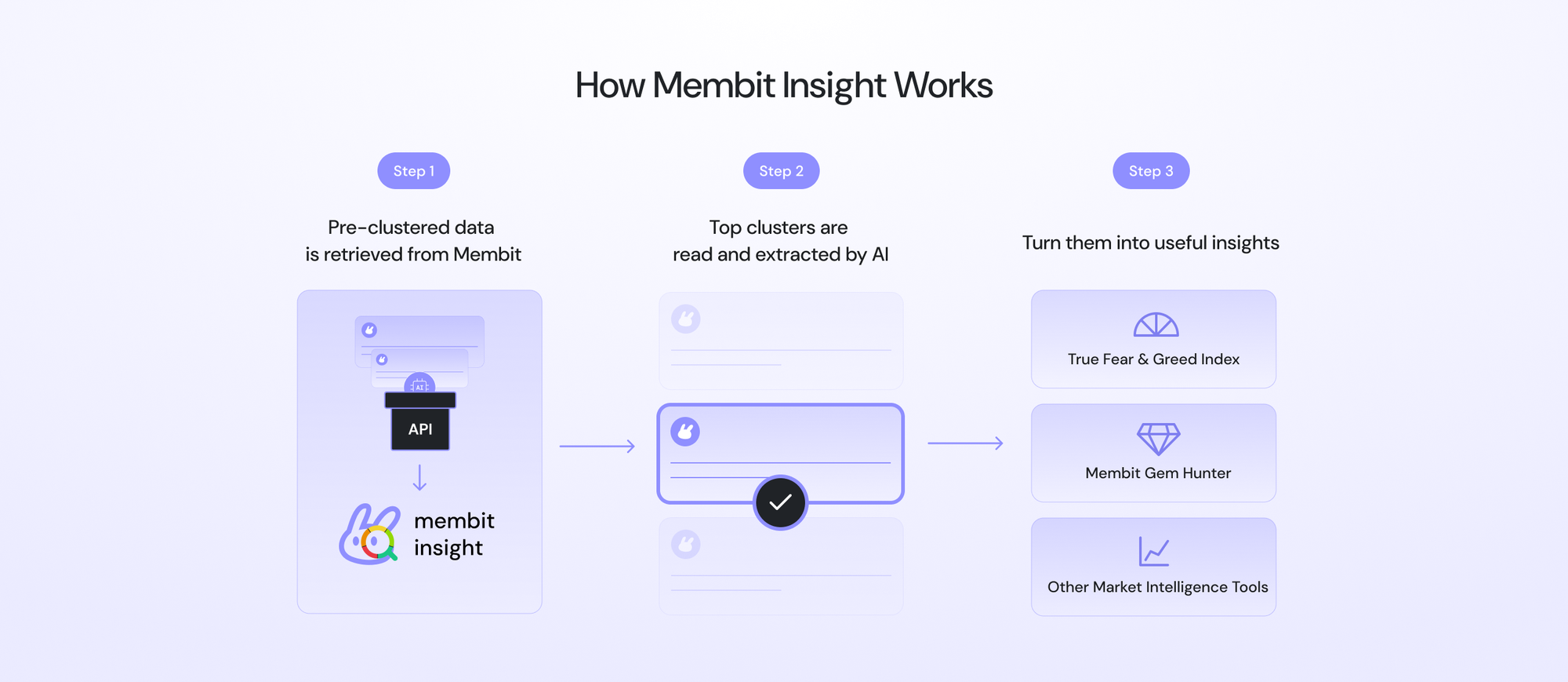 After receiving the clustered data from the Membit API, Membit Insight employs an AI Agent with an engineered prompt to perform analysis. This agent focuses on the top clusters, assigning scores and weights based on the sentiment of the posts. This process effectively identifies crucial market information, such as public sentiment for BTC or the day's trending stocks and coins. This core analytical capability is the backbone for subsequent products, including the Membit True Fear & Greed Index and Membit Gem Hunter.