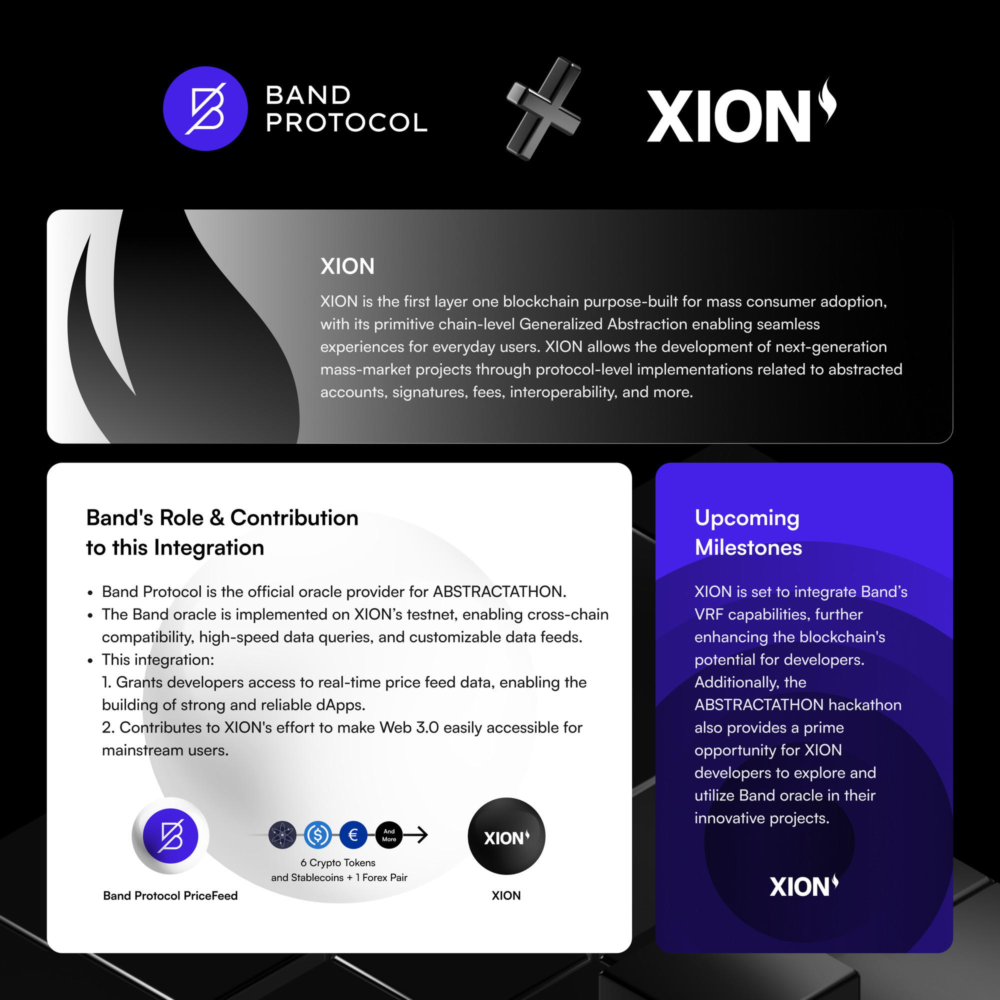 Band Protocol is thrilled to announce an integration with the XION chain, marking a key milestone at the beginning of 2024. We’re also excited to highlight our role as the official oracle partner in the on-going ABSTRACTATHON, a hackathon hosted by XION. This involvement underscores Band Protocol’s dedication to nurturing creativity and development in the blockchain community. This dual achievement not only reinforces our commitment to advancing blockchain technology but also emphasizes our focus on contributing to dApps development in this rapidly evolving Web3 space.